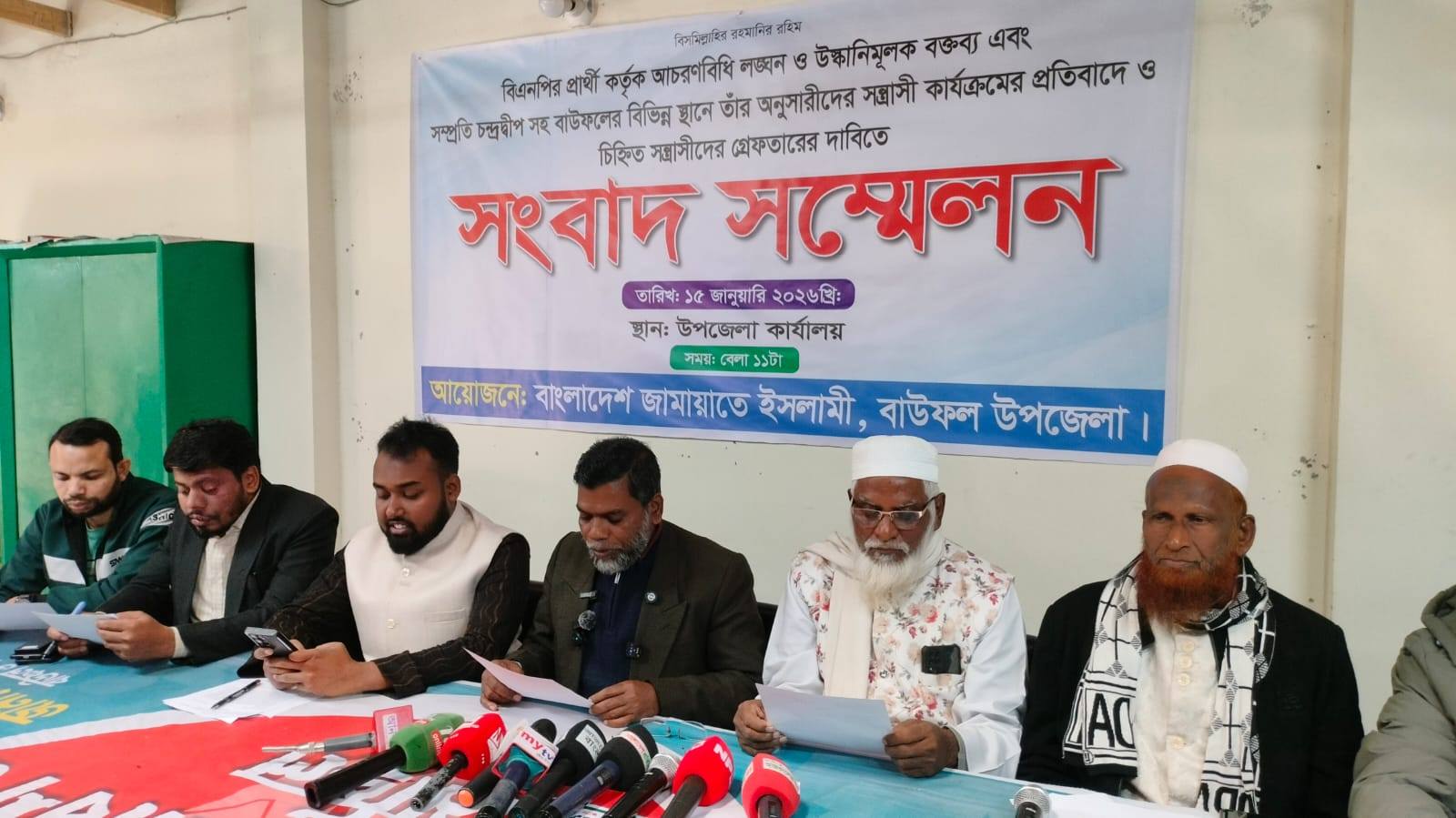 বাউফলে বিএনপি প্রার্থীর আচরণবিধি লঙ্ঘন, উস্কানিমূলক বক্তব্য এবং তাঁর অনুসারীদের সন্ত্রাসী কার্যক্রমের অভিযোগ তুলে প্রতিবাদ ও চিহ্নিত সন্ত্রাসীদের গ্রেপ্তারের দাবিতে সংবাদ সম্মেলন করেছে বাংলাদেশ জামায়াতে ইসলামী, বাউফল উপজেলা শাখা।