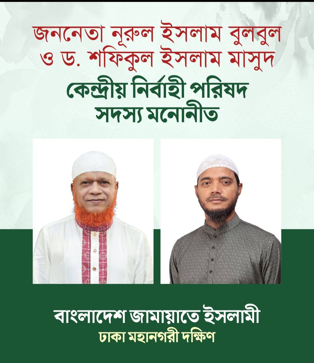 বাংলাদেশ জামায়াতে ইসলামীর ২০২৬–২৮ বর্ষের পূর্ণাঙ্গ কেন্দ্রীয় কমিটি গঠিত হয়েছে। শুক্রবার (২০ ফেব্রুয়ারি) আমীরে জামায়াত ডা. শফিকুর রহমানের সভাপতিত্বে কেন্দ্রীয় মজলিসে শূরা সদস্যদের এক সভা অনুষ্ঠিত হয়। সভায় ২১ সদস্যবিশিষ্ট নির্বাহী পরিষদ গঠিত হয়। এতে ঢাকা মহানগরী দক্ষিণের আমীর জননেতা মো. নূরুল ইসলাম বুলবুল (এমপি) এবং মহানগরীর সেক্রেটারি ড. শফিকুল ইসলাম মাসুদ (এমপি)কে নির্বাহী পরিষদের সদস্য হিসেবে মনোনীত করা হয়।